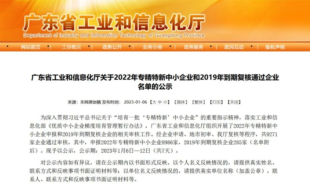 为了深入贯彻习近平总书记关于”培育一批专精特新中小企业“的重要指示精神,落实工业和信息化部《优质中小企业梯度培育管理暂行办法》(工信部企业〔2022〕63号,广东省工业和信息化厅开展2022年专精特新中小企业申报与到期复核相关审核工作,制定了《优质中小企业梯度培育管理实施方案(2022年版)》,并于2022年8月组织开展了2022年创新型中小企业评价、专精特新中小企业认定和复核工作。