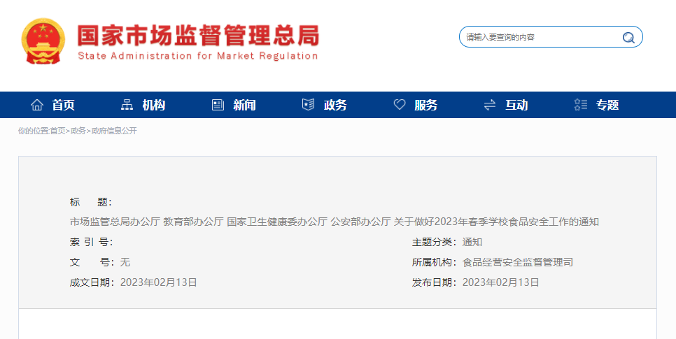 各省、自治区、直辖市和新疆生产建设兵团市场监管局(厅、委)、教育厅(教委、教育局)、卫生健康委、公安厅(局): 为有序推进2023年春季学期学校和幼儿园(以下统称学校)食品安全监管工作,全力保障广大师生“舌尖上的安全”,现就有关事项通知如下: 一、全心守护,压实落细“两个责任”。各地有关部门要坚决落实食品安全“四个最严”要求,按照《中华人民共和国食品安全法》《学校食品安全与营养健康管理规定》《关于落实主体责任强化校园食品安全管理的指导意见》等有关文件要求,依职责强化学校食品安全管理,持续推进校园食品安全守护行动,压紧压实属地监管责任,完善末端发力、终端见效的制度机制。各地市场监管部门要指导校外供餐单位和学校食堂按照《企业落实食品安全主体责任监督管理规定》有关要求,依法配备食品安全总监和食品安全员。各地教育部门要督促学校和幼儿园落实食品安全校长(园长)负责制和相关负责人陪餐制度。各地市场监管、教育部门要指导校外供餐单位和学校食堂在开学前全面开展食品安全自查,加大对因受新冠疫情影响、较长时间停止餐食供应的校外供餐单位和学校食堂的指导检查力度,及时防范化解食品安全隐患。 二、全程严控,规范加工制作过程。各地市场监管、教育部门要督促校外供餐单位和学校食堂按照《食品安全国家标准 餐饮服务通用卫生规范》(GB31654—2021)和《餐饮服务食品安全操作规范》等要求,严格执行索证索票、进货查验、从业人员健康管理、食品留样等制度,强化食品采购、贮存、加工、配送和餐饮具清洗消毒等各环节管理,严控食品安全风险。各地教育部门要会同有关部门指导学校设定招标门槛、实行大宗食品公开招标、集中定点采购,严格履行招标程序,及时公布中标的校外供餐单位名单,建立健全校外供餐单位引进和退出机制。 三、全覆盖检查,加大监督整改力度。各地市场监管部门要会同教育部门进一步加大监督检查力度,加强公正文明执法,综合运用说服教育、劝导示范、警示告诫、指导约谈、行政处罚等方式,依法依规查处食品安全违法违规行为,对检查中发现的食品安全问题和隐患督促限期整改到位。严格执行《中华人民共和国未成年人保护法》对学校周边不得设置售烟、售酒网点及禁止向未成年人售烟、售酒的规定,严肃查处学校及周边、网络平台等面向未成年人无底线营销食品等违法违规行为。各地教育部门要督促中小学校、幼儿园原则上不在校内设置小卖部、超市,确需设置的,不宜售卖高盐、高糖及高脂食品。各地公安机关要及时受理、依法立案侦查涉嫌犯罪的食品安全案件,依法严厉打击学校及周边、网络平台食品安全违法犯罪行为。 四、全力以赴,制止餐饮浪费行为。各地市场监管、教育部门要督促校外供餐单位和学校食堂对照《中华人民共和国反食品浪费法》开展自查自纠,建立并实施反食品浪费管理制度,将防止食品浪费理念纳入供餐食谱设计,按照用餐人数和营养均衡的原则配置菜品、主食,加强食品在采购、储存、加工、发放等环节的减损管理。各地教育部门要指导学校深入开展反食品浪费宣传教育,培养学生养成勤俭节约、珍惜粮食的文明用餐习惯,践行“光盘行动”;指导学校建立防止食品浪费的监督检查机制。 五、全面普及,提高师生健康素养。各地教育部门要会同市场监管、卫生健康部门为学校提供食品安全和营养健康指导,加强学校相关工作人员培训,创新培训形式,拓宽培训渠道,为学生普及食源性疾病预防和平衡膳食的知识技能。各地教育部门要鼓励、指导有条件的学校配备营养指导员,发挥专业人员作用,根据学生年龄和生长发育特点,提供均衡营养膳食,倡导学生餐食减油、减盐、减糖;鼓励学校创建营养健康食堂,公布学生餐带量食谱和营养成分;引导学生养成勤洗手、常喝水、多通风、勤锻炼、注意咳嗽礼仪等良好生活习惯。 六、全民参与,提升智慧监管效能。各地市场监管、教育部门要持续推进校外供餐单位和学校食堂“互联网+明厨亮灶”提质扩面,加快智慧监管赋能,提升学校食品安全管理水平;鼓励家长委员会等参与校园食品安全管理,营造良好社会共治氛围。各地有关部门要科学研判、精准施策,不断完善校园食品安全管理协作机制,增进信息互通,加强工作交流,形成监管合力,多措并举,织密校园食品安全防护网。市场监管总局办公厅 教育部办公厅