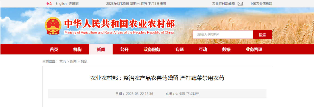 3月21日, 农业农村部 ”2023年全国农产品质量安全监管工作会议“在云南省昆明市召开。会议表示,针对一些农产品农兽药残留方面的突出问题将在严打蔬菜禁用农药源头上下功夫。据介绍,2022年全国农产品监测合格率达到97.6%,农产品质量安全形势持续向好。但是,农产品质量安全隐患依然不少,禁用药物的违法使用虽有下降但并未杜绝,防止常规农药超标成为新时期的重要任务。
