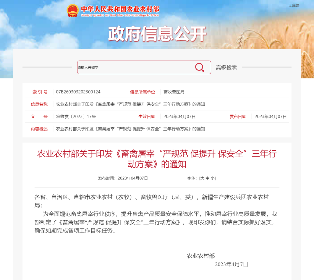 为贯彻落实《中华人民共和国畜牧法》、《中华人民共和国动物防疫法》、《中华人民共和国农产品质量安全法》和《生猪屠宰管理条例》,以及《国务院办公厅关于促进畜牧业高质量发展的意见》有关要求,全面规范畜禽屠宰行业秩序,提升畜禽产品质量安全保障水平,推动屠宰行业高质量发展,我部决定实施畜禽屠宰“严规范 促提升 保安全”三年行动。具体方案如下。通过实施三年行动,到2025年,全国畜禽屠宰布局结构进一步优化,屠宰产能向养殖主产区集聚,与养殖产能匹配度明显提高;落后产能有序压减,牛羊禽集中屠宰扎实推进,畜禽屠宰产能利用率和行业集中度稳步提高,畜禽屠宰规范化机械化智能化水平明显提升;生猪屠宰企业全部实施屠宰质量管理规范(以下简称“屠宰GMP”),部级生猪屠宰标准化建设示范单位达200家以上,其他畜禽屠宰标准化创建稳步开展;畜禽屠宰法规标准体系进一步完善,监管能力和水平进一步提升,屠宰环节畜禽产品质量安全得到有效保障。1.健全完善法规标准体系。出台《生猪定点屠宰厂(场)设置审查办法》、《生猪屠宰质量管理规范》等管理制度,健全畜禽屠宰标准体系,全面规范畜禽屠宰行为和秩序。各地要做好《中华人民共和国畜牧法》地方配套立法工作,2025年底前完成畜禽屠宰管理地方性法规或政府规章的制修订。在边远和交通不便的农村地区确需设置小型屠宰场点的,各地要制定具体管理办法,加强场点设置和质量安全管理。2.科学规划行业发展。各地要按照科学布局、集中屠宰、有利流通、方便群众的原则,科学制定畜禽屠宰行业发展规划,合理设定辖区屠宰行业发展目标,严格控制屠宰企业数量和产能,有序压减落后产能,稳步提高屠宰产能利用率和行业集中度;优化企业布局,引导畜禽屠宰企业向养殖主产区转移,促进运活畜禽向运肉转变,推进畜禽屠宰产业转型升级。原则上生猪屠宰行业发展规划应于2023年底前出台,其他畜禽屠宰行业发展规划应于2025年底前出台。3.严格企业设立管理。畜禽屠宰企业的设立应当符合本省份畜禽屠宰行业发展规划和国家产业结构调整政策,具备法定设立条件。实行定点屠宰管理的,要依法依规严格审批。加快淘汰桥式劈半锯、敞式生猪烫毛机以及手工屠宰等落后生产工艺。不符合条件的畜禽屠宰企业,责令停业整顿,逾期仍未达到法定条件的,依法予以关闭,实行定点屠宰的要吊销定点屠宰证书。各地要及时向社会公布合法合规企业名单,对于依法设立的屠宰加工场所,动物卫生监督机构方可派驻(出)官方兽医实施检疫。4.加强过程监管。各地要加强对畜禽屠宰活动的日常监督检查,建立监督检查专家库,完善“双随机”抽查机制,实施屠宰企业信用档案管理,规范事中事后监管。加大畜禽屠宰质量安全风险监测力度,加强风险监测能力建设和经费保障。强化风险监测结果应用,做好追溯核查,有针对性地开展监督检查。加快推动牛羊禽集中屠宰、集中检疫,落实肉品品质检验等质量安全管理制度。抓好畜禽屠宰标准落实工作,全面推行生猪屠宰GMP,鼓励各地对其他畜禽实施屠宰GMP。5.严厉打击违法违规行为。对未按规定建立质量安全管理制度,出厂销售未经检验、检疫或者经检验、检疫不合格的畜禽产品的,各地要依法依规严肃查处。要加强畜禽屠宰专项整治,保持对私屠滥宰、注水或注入其他物质、屠宰病死畜禽等违法行为的高压严打态势。强化行政执法与刑事司法衔接,及时向公安机关移送涉嫌犯罪案件,严惩重处违法犯罪行为。落实“处罚到人”要求,依法实施行业禁入。6.强化责任落实。各地要督促屠宰企业切实履行畜禽产品质量安全、动物疫病防控和安全生产主体责任,严格落实法律法规和有关要求,建立健全从畜禽进厂(场)查验到产品出厂(场)以及问题产品召回等全过程质量安全管理制度,把好产品质量安全关;严格落实屠宰检疫申报、动物疫病检测、动物疫情报告和清洗消毒等疫病防控管理制度;建立健全安全生产责任制,完善安全风险分级管控和隐患排查治理双重预防机制。7.强化能力建设。各地要规范开展兽医卫生检验人员考核,到2025年底,全国生猪屠宰企业全部按规定配备经考核合格的兽医卫生检验人员,牛羊禽屠宰企业兽医卫生检验人员考核稳步推进。要督促企业建立内部培训考核制度,确保企业人员掌握相关法律法规和专业知识技能,加强人员防护管理,配备必要的防护用品,落实人畜共患病防控措施。督促屠宰企业依法执行畜禽屠宰车间设计规范、操作规程、卫生规范、消毒规范、肉品品质检验等方面的标准和技术要求。鼓励企业实施畜禽肉分割、质量分级、屠宰加工设备等推荐性国家标准和行业标准。8.推进示范创建。继续开展生猪屠宰标准化示范创建,积极推动将其他主要畜禽屠宰纳入示范创建范围。公布的示范单位可使用我部制定发布的专用标识,促进品牌建设。遴选公布一批畜禽全产业链发展典型案例,发挥示范引领作用。各地要加强对示范单位后续监管,实行动态管理,经评估不再符合条件要求的取消示范单位称号。在非洲猪瘟等重大动物疫病分区防控中,优先将屠宰标准化示范单位纳入“点对点”调运接收企业范围。9.推动智慧监管。各地要加强畜禽屠宰管理信息化建设,逐步实现对屠宰企业的智慧监管,积极推动无纸化出具肉品品