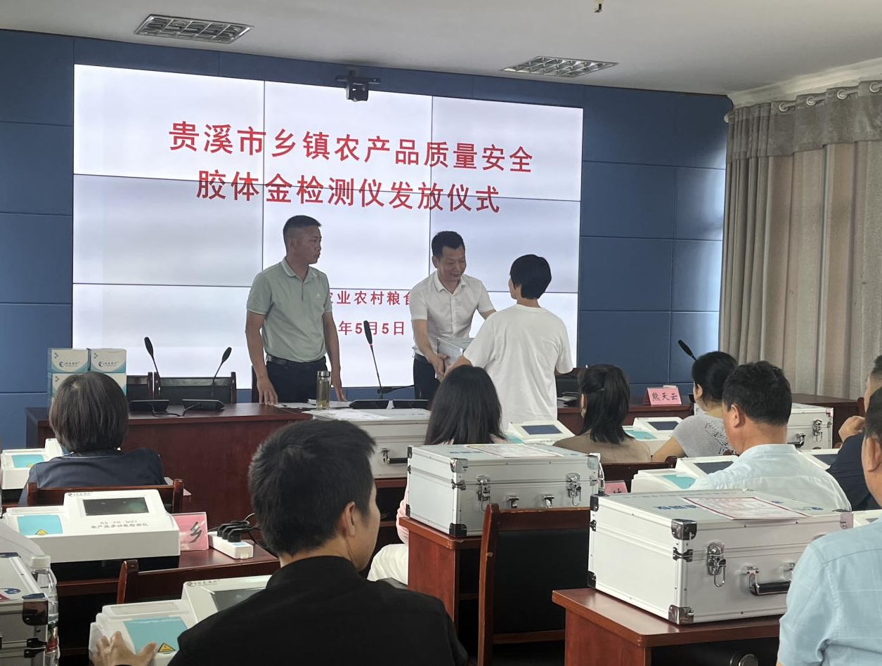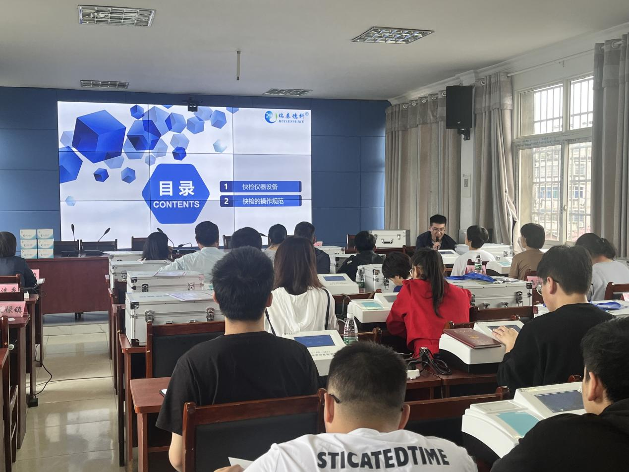 在培训会上,贵溪市农粮局为全市18个乡镇统一配备胶体金、酶抑制多功能快速检测仪,局分管领导熊天云就新设备使用、豇豆种植及检测相关注意事项做了强调,并要求大家坚决贯彻落实新农安法,严格按照部省共建有关要求开展农安工作,确保及时有效发现并处置农产品质量安全风险,确保胶体金免疫检测任务全部按时完成。 瑞森生物技术人员在本次培训会上,通过现场操作示教的方式,为现场与会人员生动详细的培训了胶体金快速检测仪的操作使用方法、使用胶体金检测卡对蔬菜农药残留进行快速检测示范操作以及畜禽产品兽药残留检测等相关内容。并现场考核了各乡镇检测人员对韭菜、空心菜、西葫芦、猪肉、牛尿等常见农产品的胶体金卡检测操作能力。