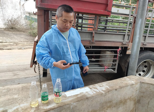 为解决养殖场户的跑腿问题,湛江市的官方兽医接收到检疫任务后,统一持着定制的移动终端机到养殖场实施现场检疫。检疫现场,查看养殖档案、瘦肉精抽检、查验运输车辆备案情况、查验生猪的畜禽标识佩戴情况、临床检查,一系列检疫程序,官方兽医利用移动终端机一一记录,并现场拍照取证、录入畜禽标识编号。检疫合格后养殖场会收到微信公众号发送的6位数字检疫证明提取码。