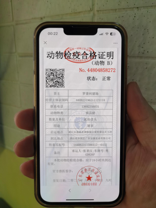 装车完毕,养殖场不再需要前往乡镇的动物检疫申报点领取纸质检疫证明,凭着提取码即可获取检疫证明电子证照。兽医的上门检疫服务,检疫证明的无纸化,让养殖场切切实实感受到了前所未有的便捷。“网上申报、网上受理、现场检疫、电子证照”的检疫模式,彻底打通服务养殖场户“最后一公里”。