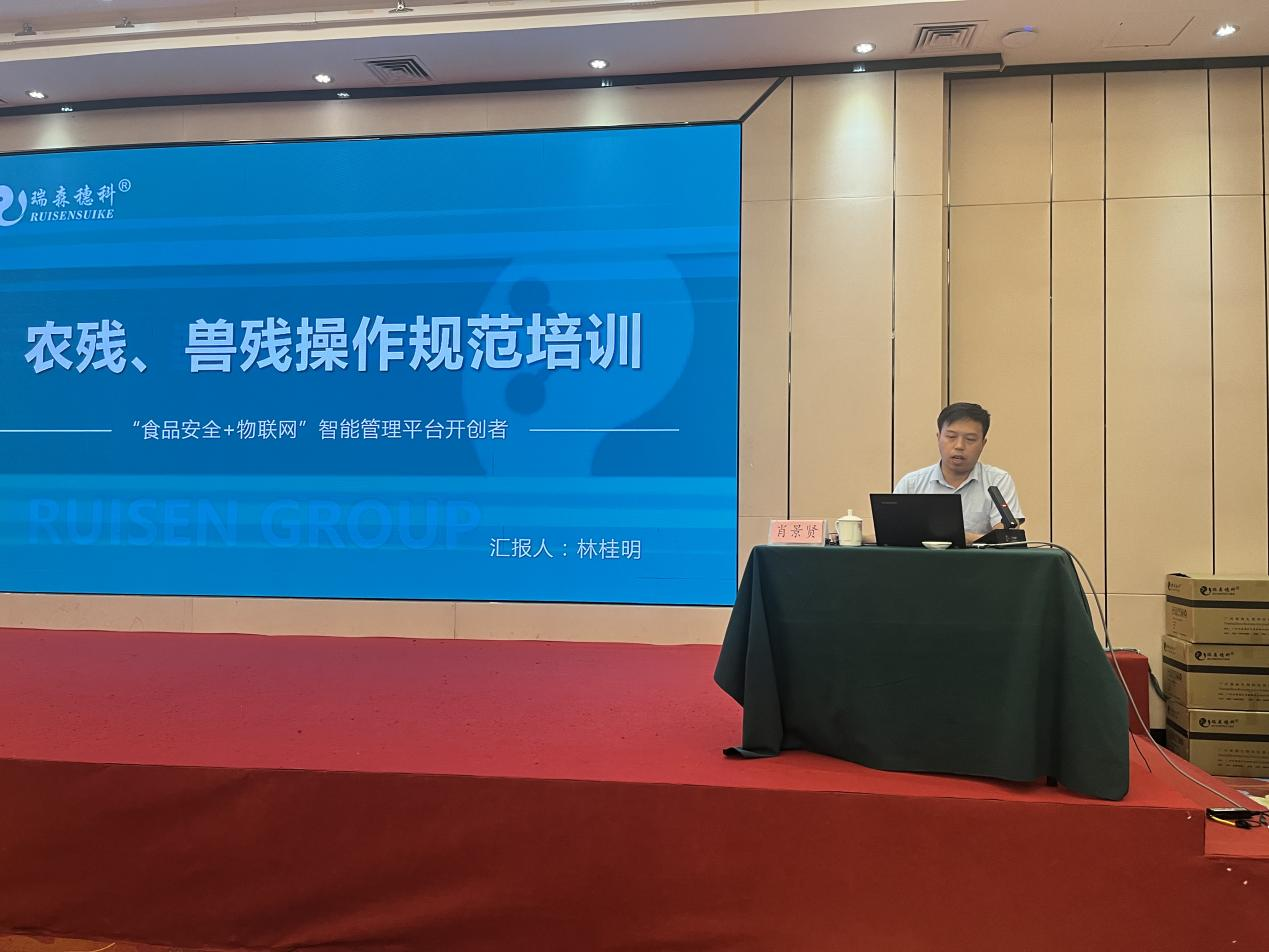 本次培训班会议瑞森生物的培训工作大致分为三个部分,一是食用农产品快检技术培训理论授课讲解,二是农残、兽残操作规范培训的理论授课讲解,三是食用农产品快检技术的实操培训。在食用农产品快检技术培训理论讲解课上,瑞森生物技术副总罗奕铭先生为与会人员讲解了“快检技术的应用”、“2000家农贸市场工作要求文件解读”、“快检工作存在的问题”、“快检考核的要点”等相关理论知识;在农残、兽残操作规范培训的理论授课上,瑞森生物技术经理林桂明先生为与会人员讲解了“农残酶抑制法及胶体金检测技术”、“检测的注意事项及规范操作”等相关理论知识。两位同事的讲课内容深入浅出,受到了现场与会人员的一致好评,并取得良好效果。