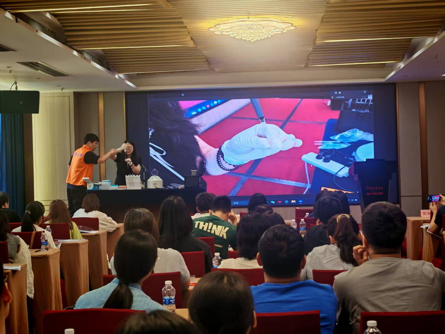 瑞森技术人员现场演示了农产品快速检测的关键操作环节,包括抽样、制样与检测的全过程,并对检测设备的标准化使用流程进行了细致讲解。演示内容紧贴实际检测场景,涵盖样品前处理步骤、试剂配置、设备操作、结果判读及记录等要点。来自佛山市及各县区农业农村部门、镇街监管单位的参训学员在现场认真观摩、积极提问,进一步加深了对快检流程和仪器规范使用的理解。通过实景式演示,有效提升了参训人员对检测流程的整体把控能力,也为后续实操训练奠定了扎实基础。